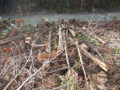まずは力任せに杉を道路近くまで引き摺り下ろします。