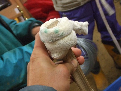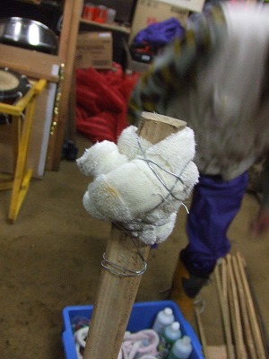 まずは竹の棒にアルコールを染み込ませるための布をまきつけます。